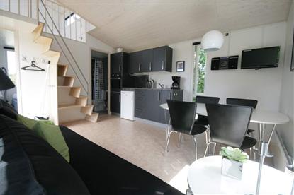 Binnen is er veel licht en ruimte, met hoge plafonds, een goed uitgeruste keuken, badkamer en toilet, slaapkamer en een ruime slaapzolder voor de kinderen. Er kan veel worden ingepast op 25 m², maar om het ook nog eens stijlvol en ruimtelijk te maken, levert extra punten op in ons rapport. Bekijk onze fotogalerij ? we vinden zelf dat de foto's voor zich spreken.