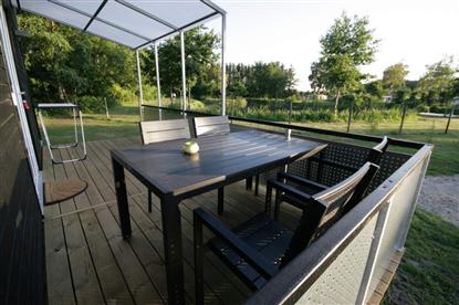 Een deel van de filosofie van kamperen is leven in harmonie met de natuur. Hoewel we in de loop der tijd echte levensgenieters zijn geworden, spreekt het idee om in de natuur te leven ons nog steeds aan. En juist met de natuur kom je in nauw contact op het extra grote, en deels overdekte terras bij de hut.