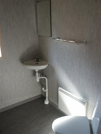Een kleine wastafel, vrijwel geen aflegruimte, en een donkerblauw verduisteringsdouchegordijn, dat het moeilijk maakt om 's avonds te douchen.