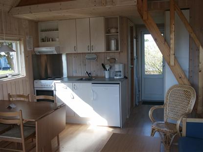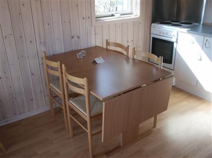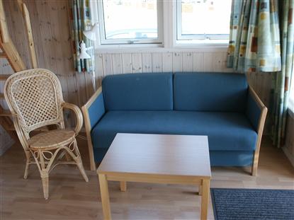 De Bogense-Hut is ingericht met een grote woonkamer, met een tafel voor 6 personen en een bank.
