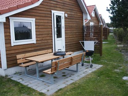 De ene is een overdekt houten terras met bijbehorend tuinmeubilair.