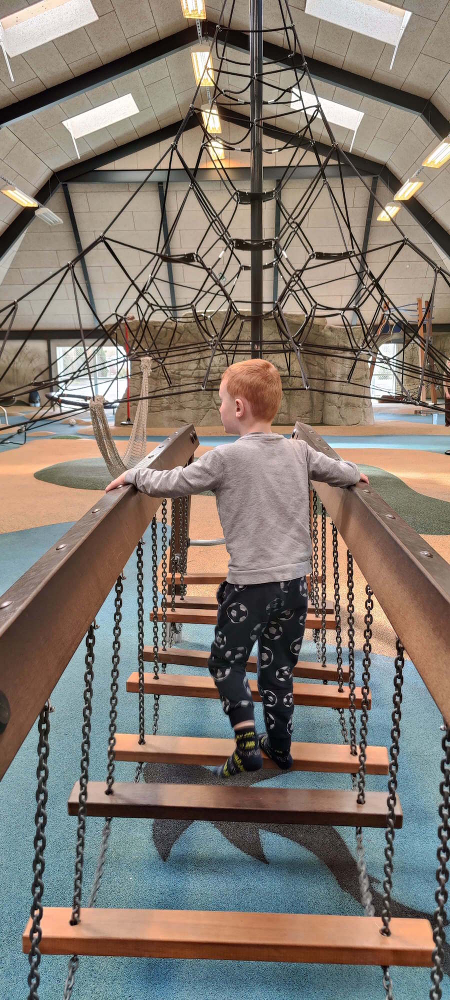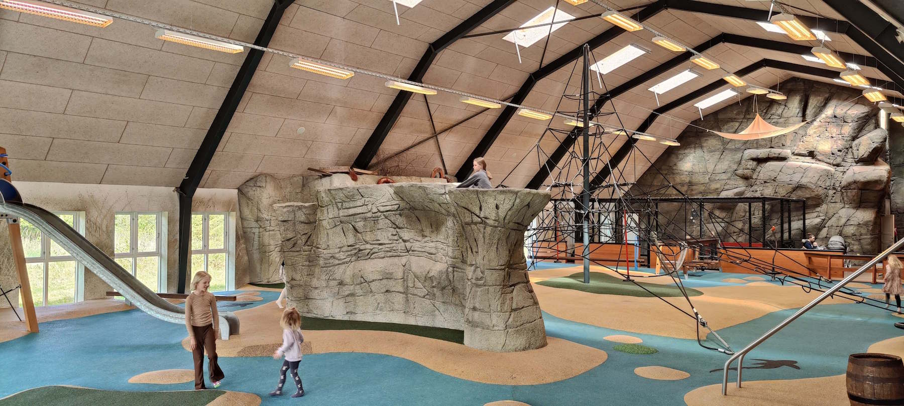 Binnen vind je namelijk een enorm speelparadijs van maar liefst 600 m2 met een klimnet in het midden, en kleine "eilanden" waar de kinderen tussen kunnen springen.