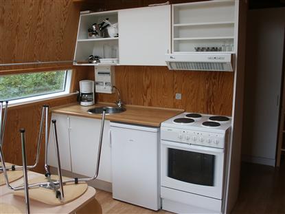 De keuken is van een passende grootte met een bijbehorend fornuis en koelkast met vriezer. Verder is alles aanwezig wat je aan servies nodig hebt.