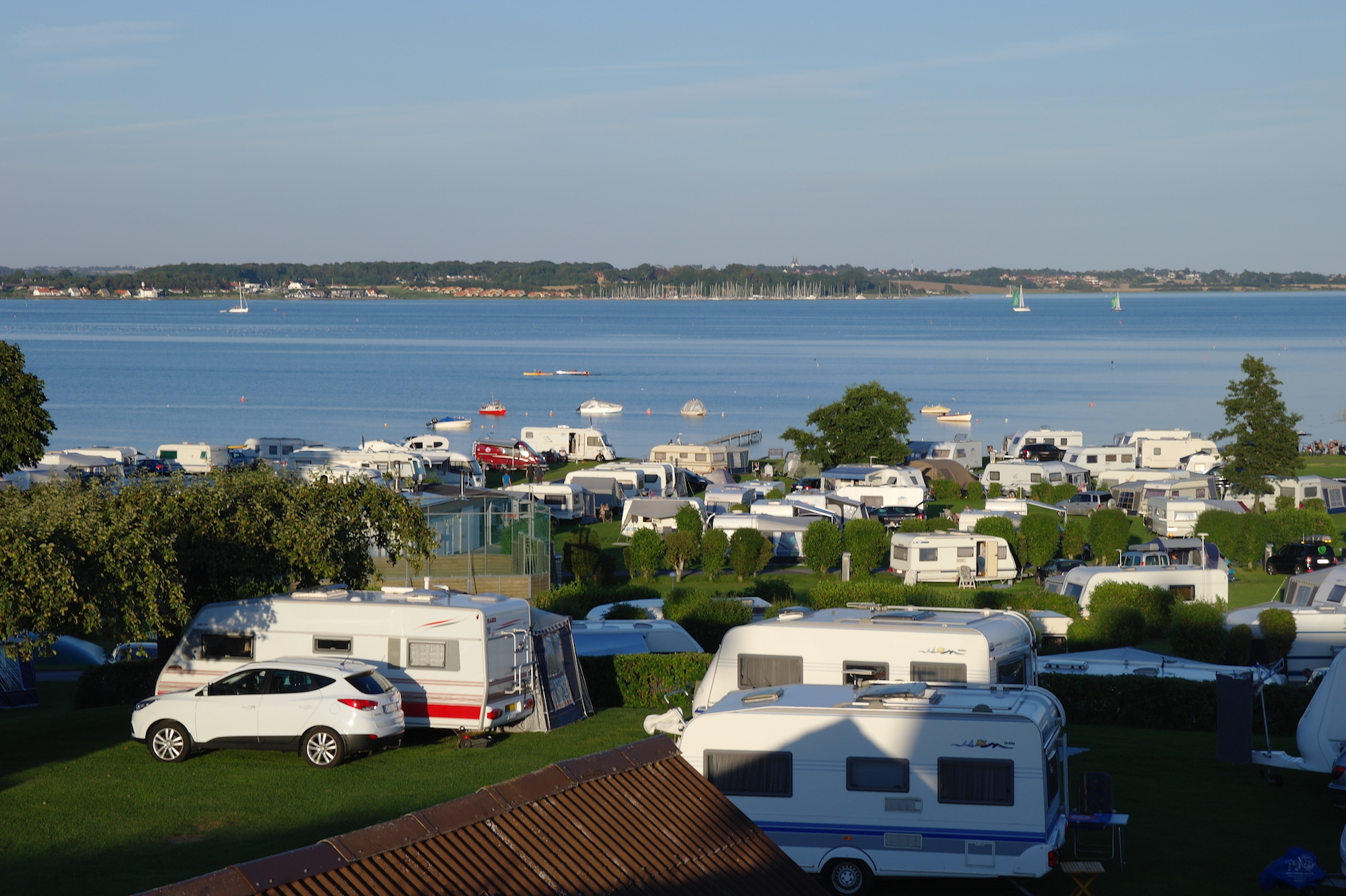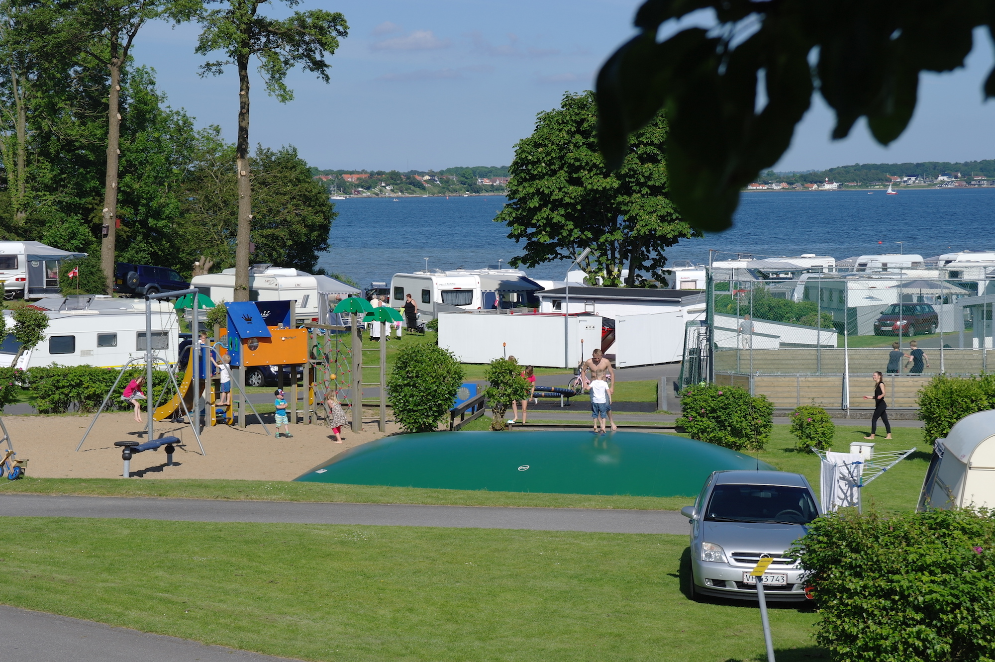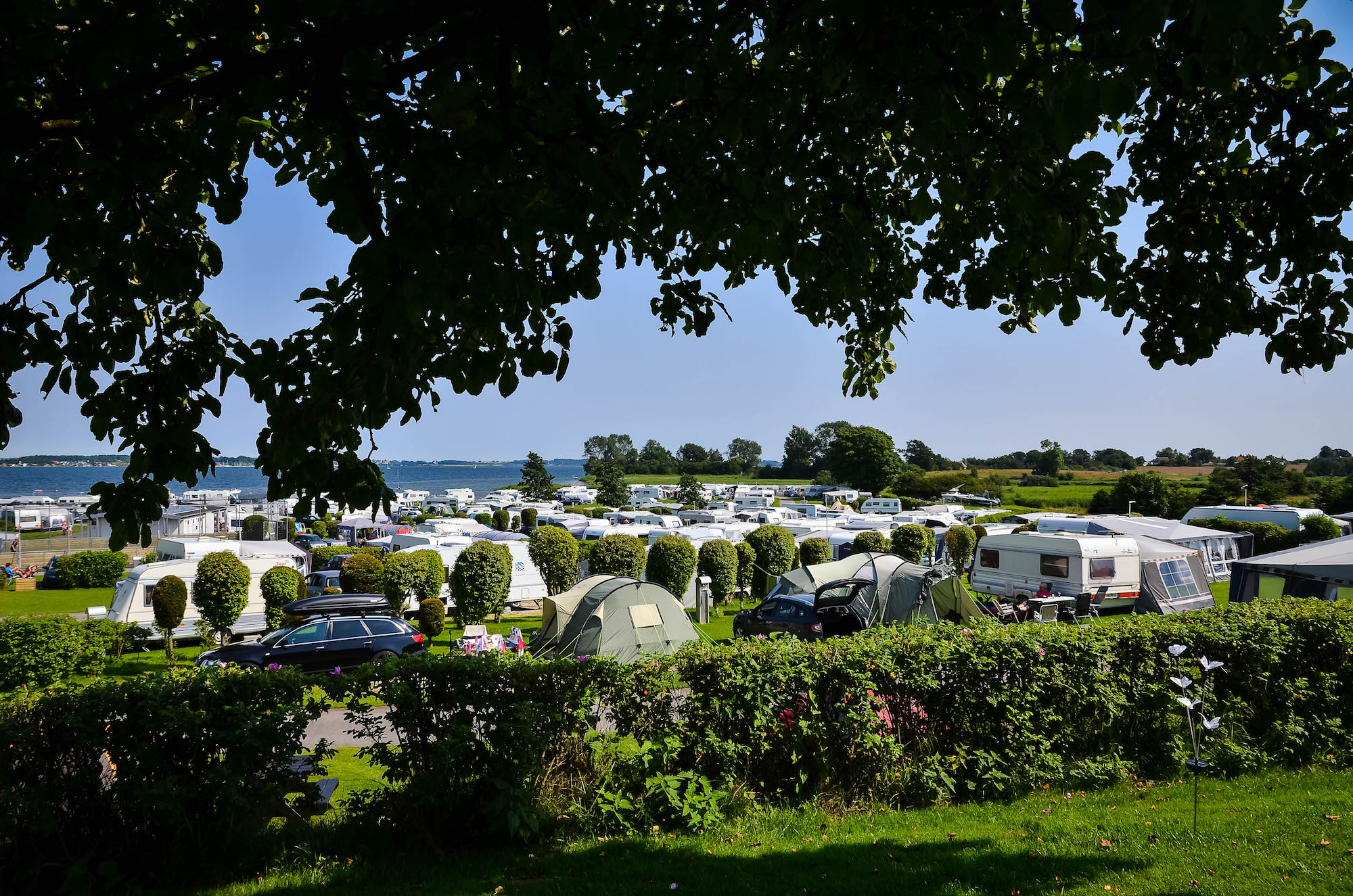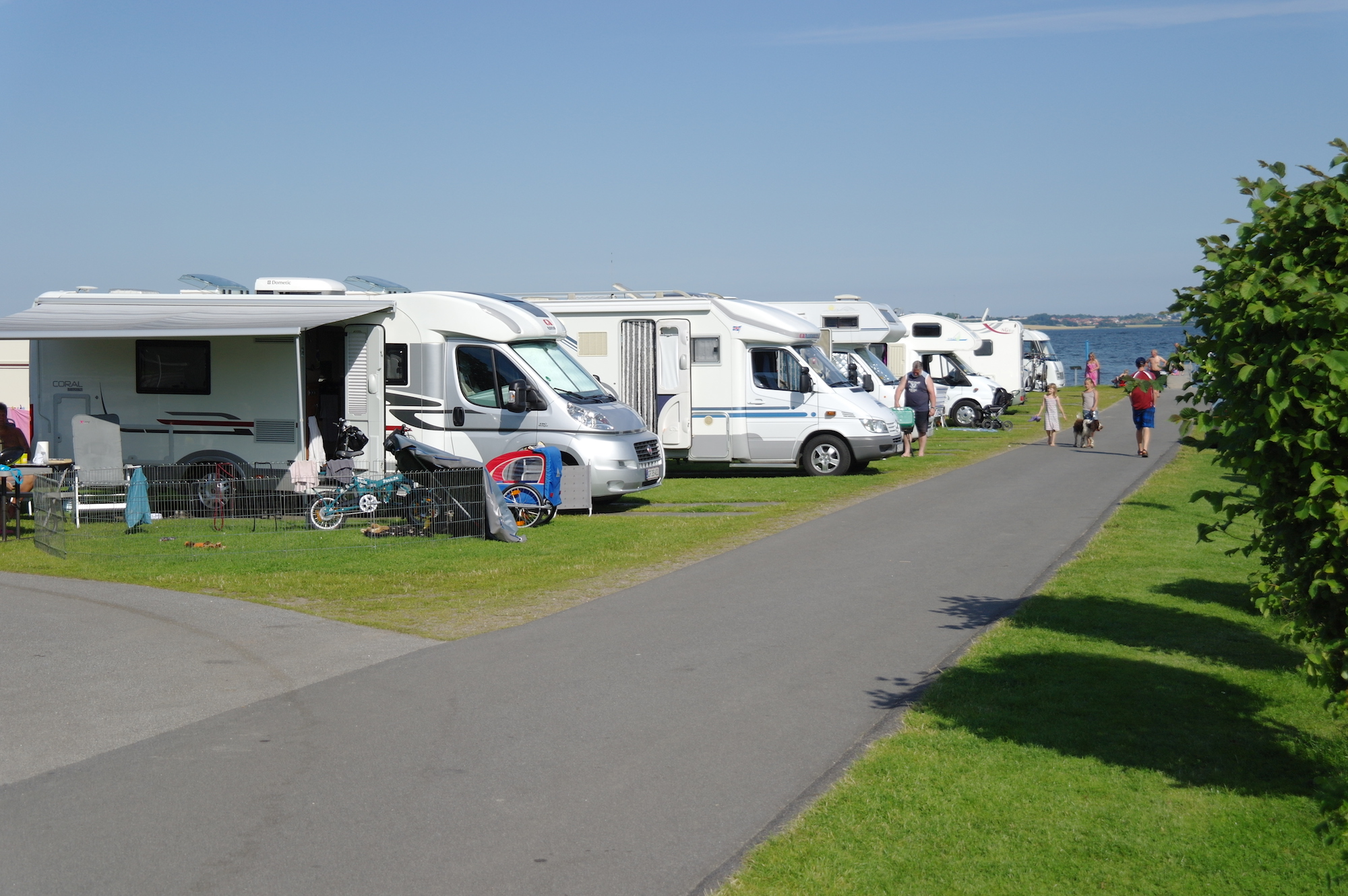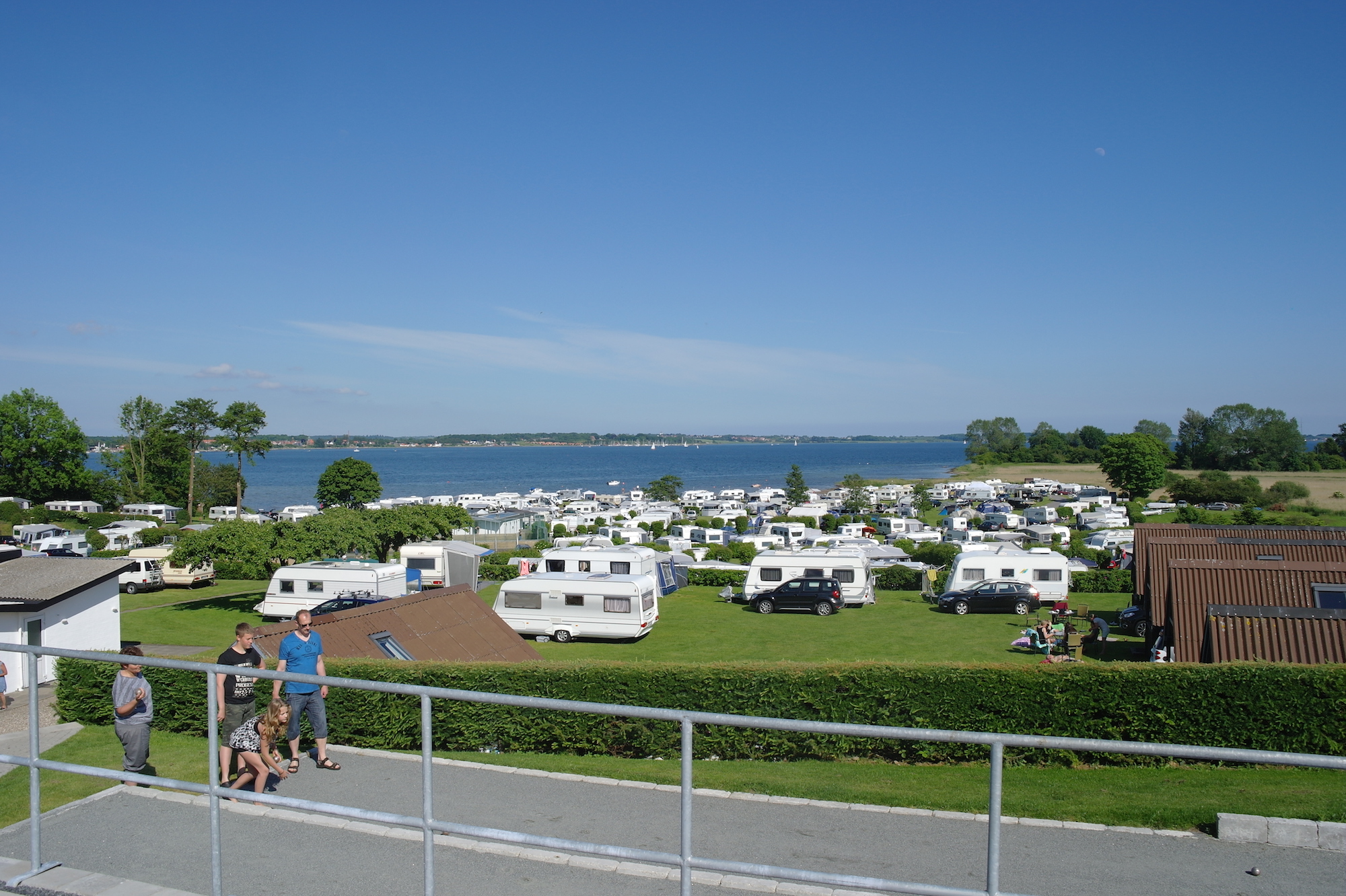 En als we zeggen aan de voet van - dan menen we dat. Je kunt je rijdende vakantiehuis letterlijk zo plaatsen dat je je voeten in het natte element steekt zodra je de deur van de caravan opent, en dat is een zeldzaamheid op een Deense camping.