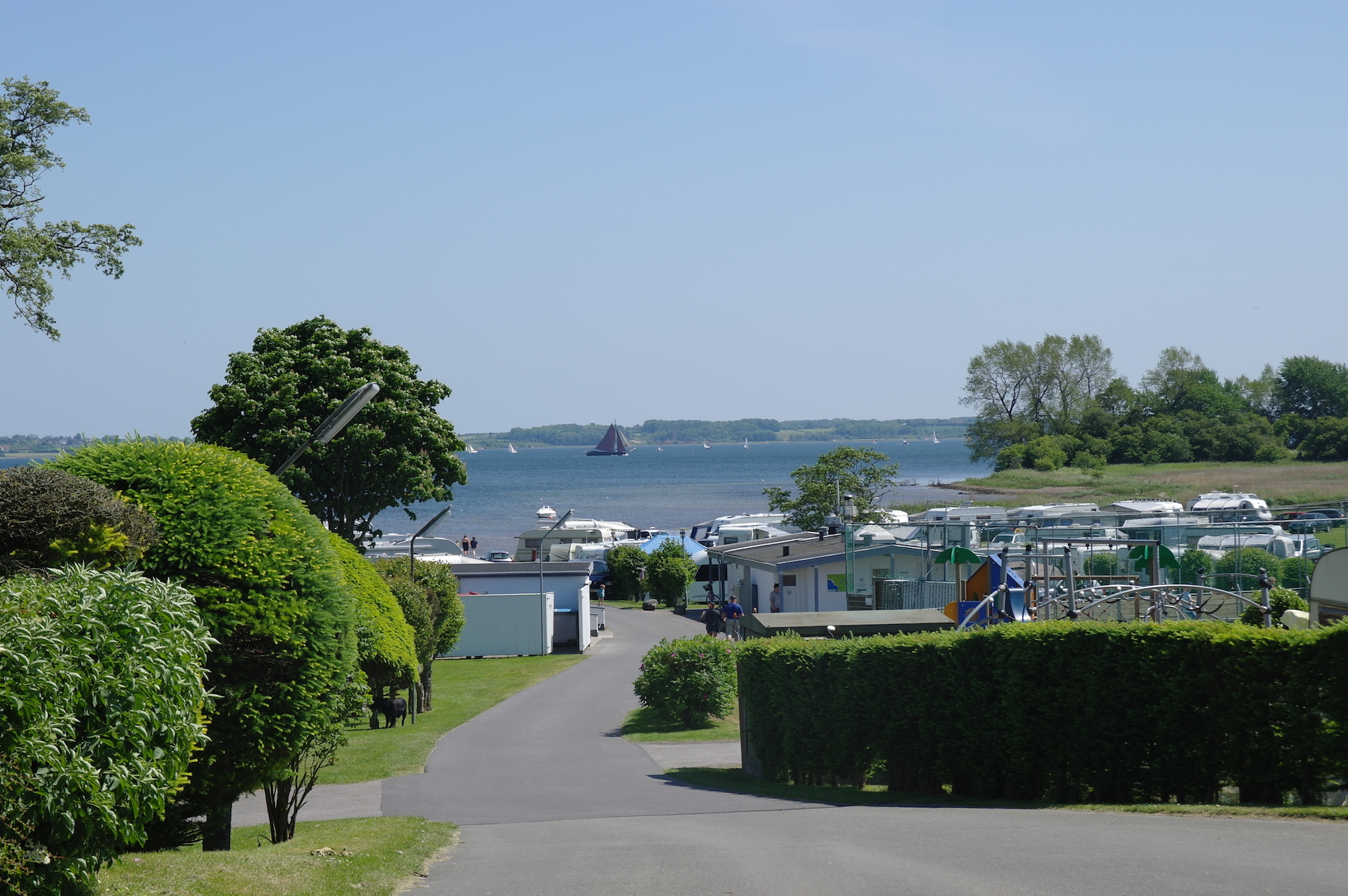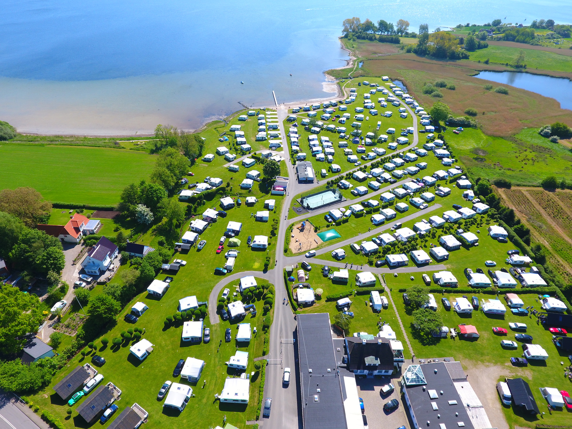 De camping ligt op een glooiend terrein dat grenst aan het eigen kleine strand van de camping aan de Flensburger Fjord.