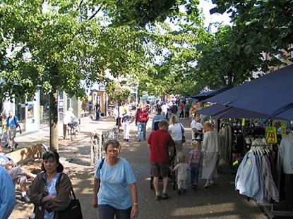 Een kilometerslange en sfeervolle winkelstraat vertakt zich vanaf de haven van de stad. Kledingwinkels, cafés en speciaalzaken liggen zij aan zij met de al legendarische "Ritz" waar de totaal toonloze Sussi & Leo nu hun kunsten vertonen na de breuk met Skansen in Skagen.
