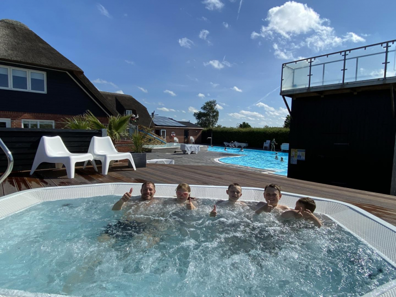 Groot bubbelbad voor 14 personen, met een aangename temperatuur van maar liefst 37 graden. Vanuit het bubbelbad heb je uitzicht over het zwembad en op het spa-terras kun je heerlijk genieten van de zon.