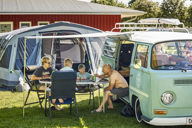 Verschillende plaatsen bieden een prachtig uitzicht over het fjord en liggen toch dicht bij de faciliteiten. Er zijn drie goede tentgebieden die aan zeer uiteenlopende wensen voldoen. Om beschutte plekken te creëren is het terrein opgedeeld met kleine hagen en grote groepen bomen en struiken. We hebben momenteel 240 plaatsen en 25 verschillende hutten en stacaravans.
