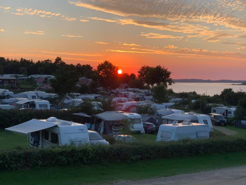Hjarbæk Fjord Camping heeft een unieke ligging in een glooiend landschap, waar een groot deel van het terrein is opgedeeld in terrassen met een prachtig uitzicht over de fjord.