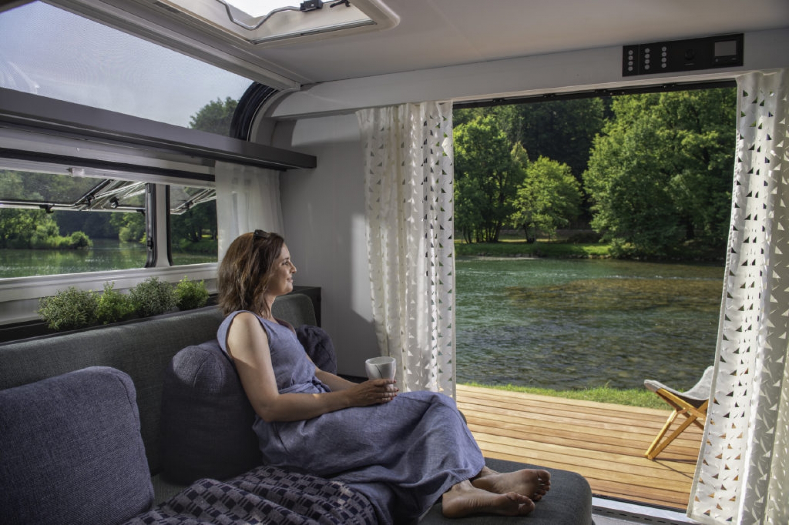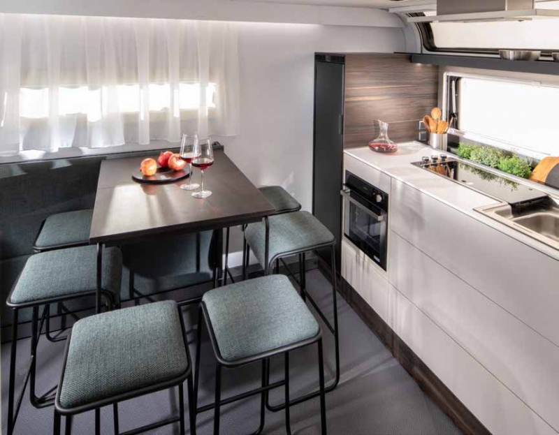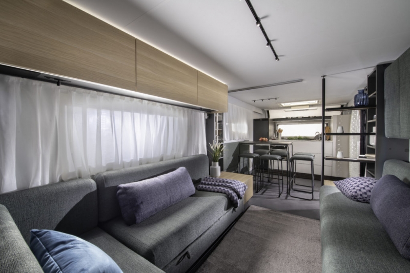 Er is veel aandacht besteed aan details, met ingebouwde ramen in een vlak design, dakramen aan zowel de voor- als achterkant, en zacht LED-licht dat dienstdoet als voortentlamp en elegant de iconische vorm van de caravan accentueert.