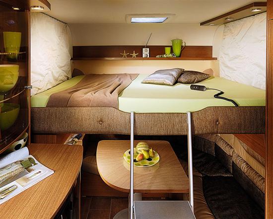 De ontwerpers zaten op de eerste rij toen er fantasie werd uitgedeeld bij Bürstner, en dat hebben ze weten om te zetten in een paar vernieuwende en spannende oplossingen. Binnen in de caravan is er ruimte gecreëerd voor extra slaapplaatsen door een nieuw concept te introduceren – het “hefbed” of zoals Bürstner het zelf noemt: het hefslaapbed. In de praktijk wordt het bed overdag onder het plafond opgeborgen en is het netjes gecamoufleerd als sterrenhemel. ’s Avonds wordt het bed naar beneden gehaald en is het binnen een halve minuut klaar voor gebruik.