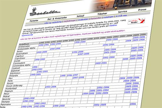 Op de Isabella-pagina’s kun je handleidingen en stangenoverzichten vinden van een groot aantal Isabella-tenten, bijvoorbeeld de "Diplomat" die werd geproduceerd van 1990-1993, of een van de nieuwere tenten zoals de "Zenith Lux" die in 2006 op de markt is gekomen.