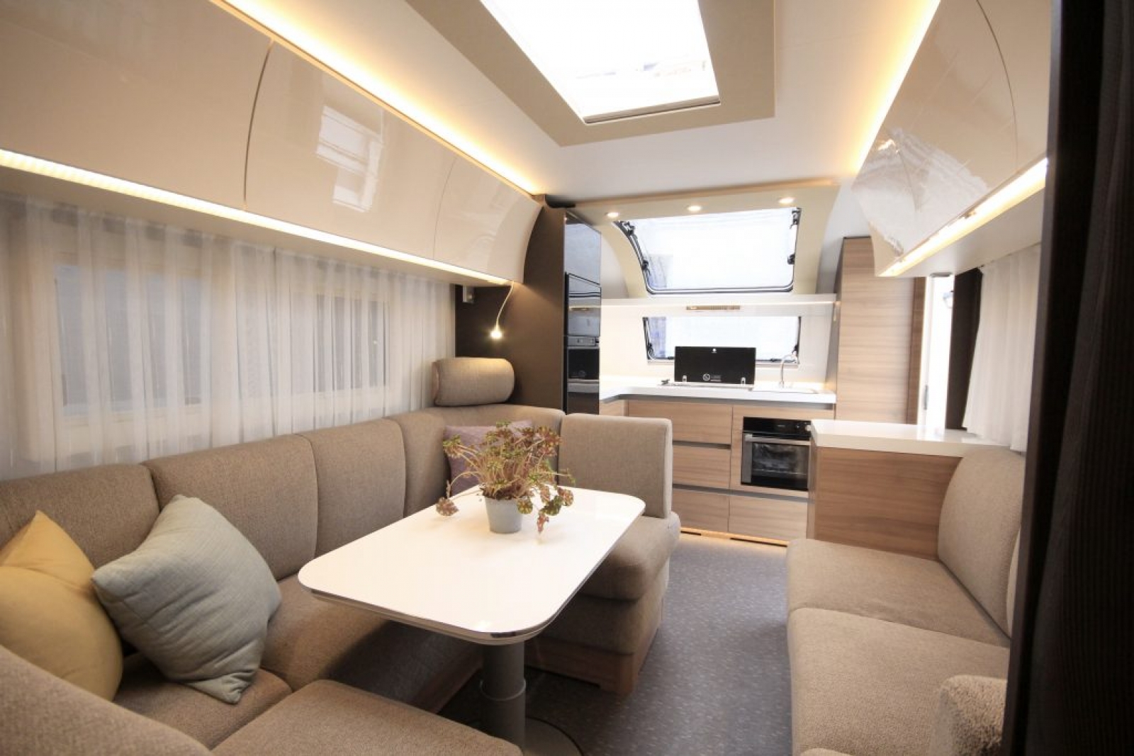 De hoekkeuken en lounge in het voorste deel van de caravan zijn rechtstreeks overgenomen van de populaire 663 HT. Je wordt met andere woorden verwend met een volledig uitgeruste keuken, inclusief gasoven, en het werkblad is werkelijk royaal. Bovendien heb je het mooiste uitzicht door het sky-light raam terwijl je in de keuken aan de slag bent.