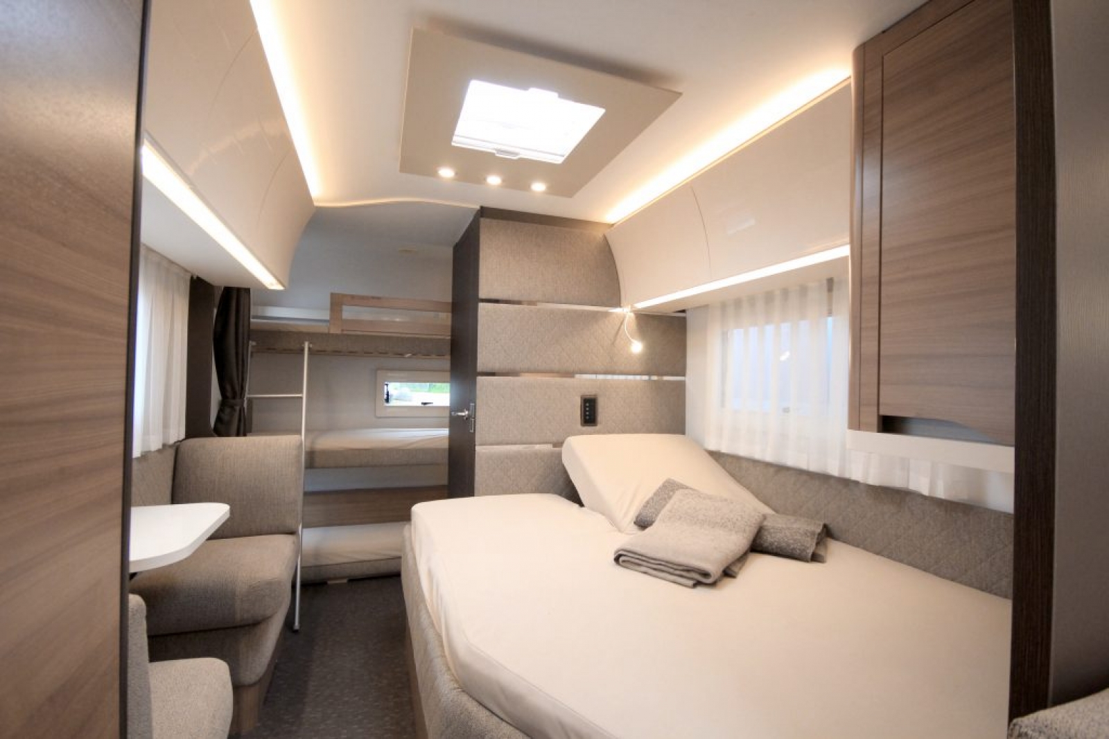 In het andere deel van de caravan draait het om ontspanning voor zowel kinderen als volwassenen. Hier vind je een ouderlijke slaapkamer, badkamer, stapelbedgedeelte en een klein zitje voor de jongste gezinsleden.