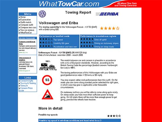 Op de buitenlandse site Whattowcar.com kun je auto en caravan samenvoegen in een database. Na een berekening krijg je het resultaat te zien, dat is onderverdeeld in 6 hoofdcategorieën. Elke categorie geeft informatie over de capaciteiten van de auto als trekauto met een specifieke caravan erachter.